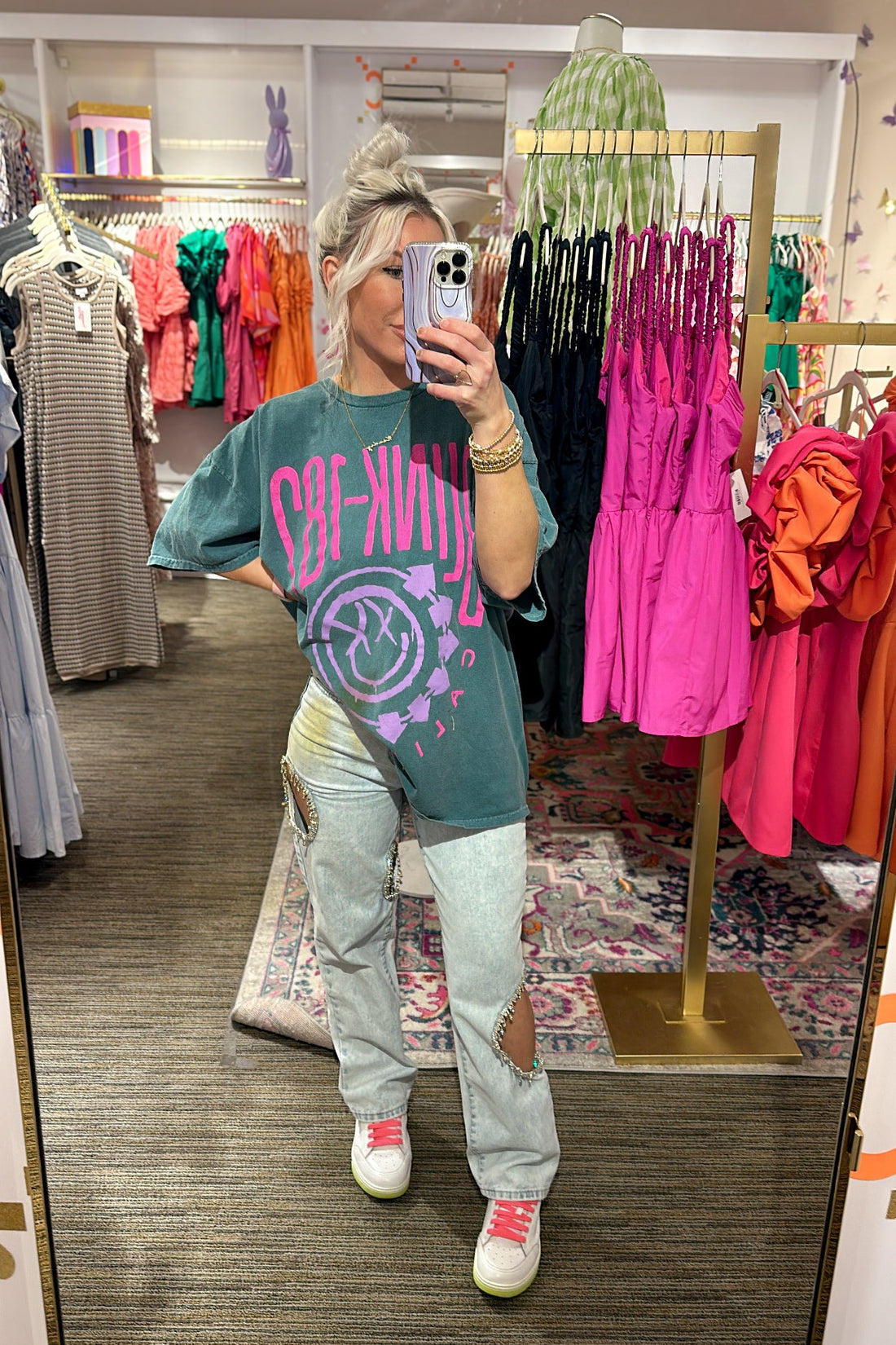 Distressed Pearl and Rhinestone Wide Leg Jeans