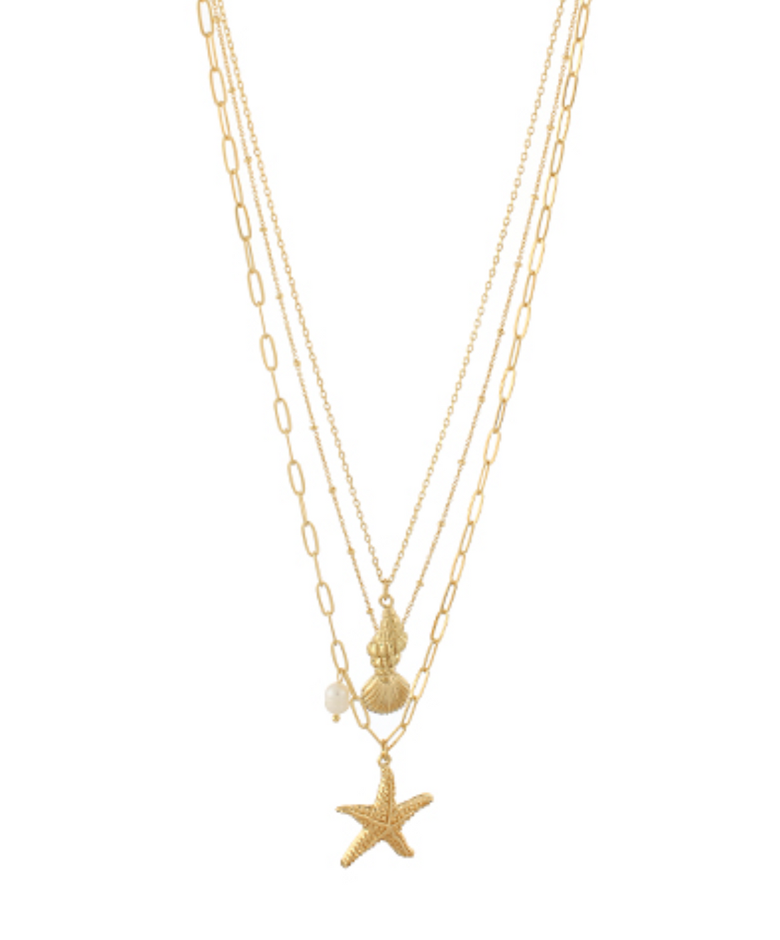 Triple Chain Pearl Seashell and Starfish Charm Necklace
