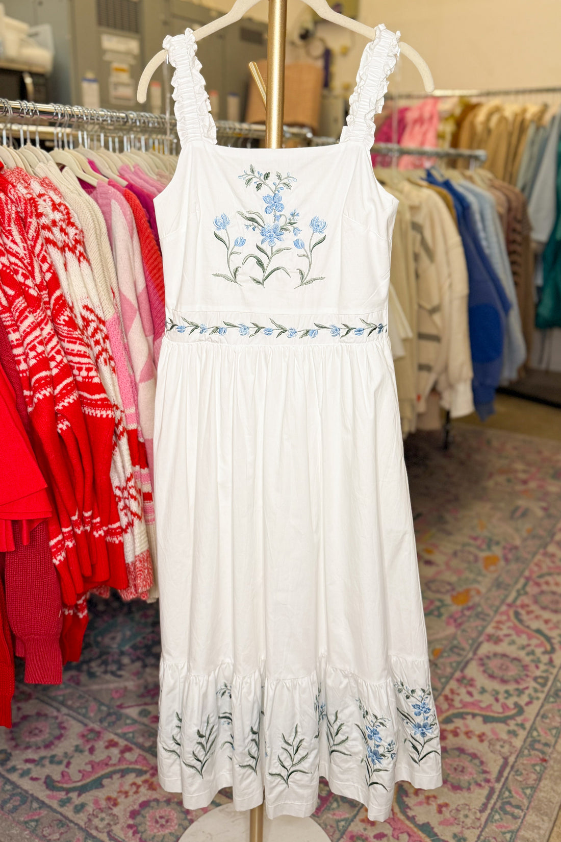 White Square Neck Maxi Dress With Blue Embroidered Floral Detail