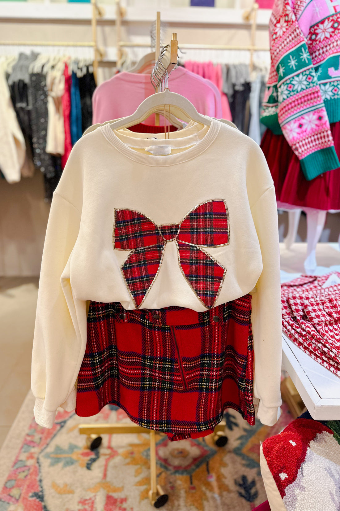 Cream Sweatshirt With Red Plaid Bow
