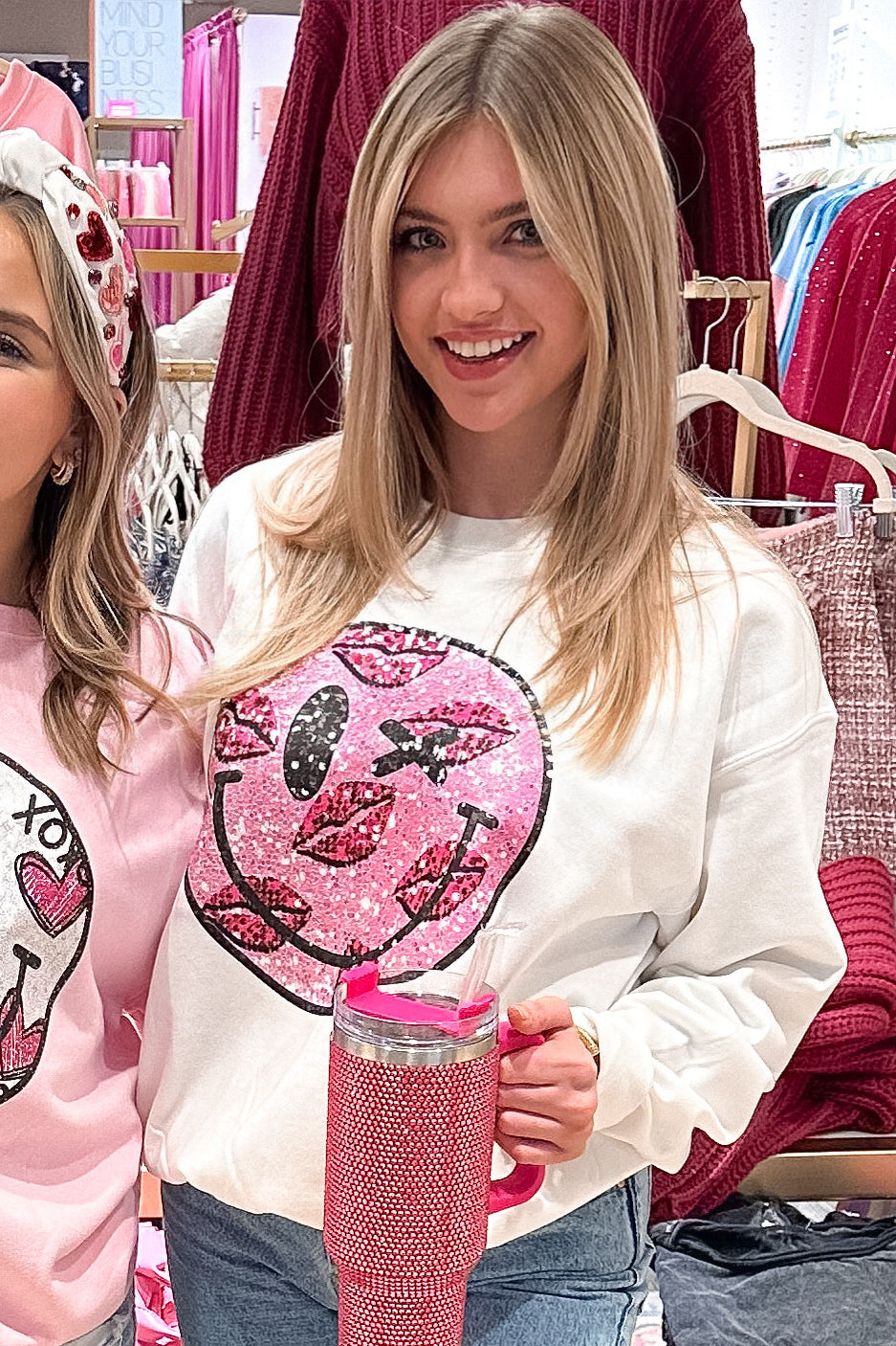 White Faux Sequin Smiley Face Kisses Sweatshirt