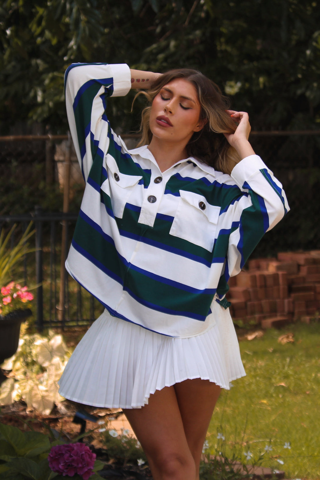Green And Navy Blue Striped Collared Rugby Top