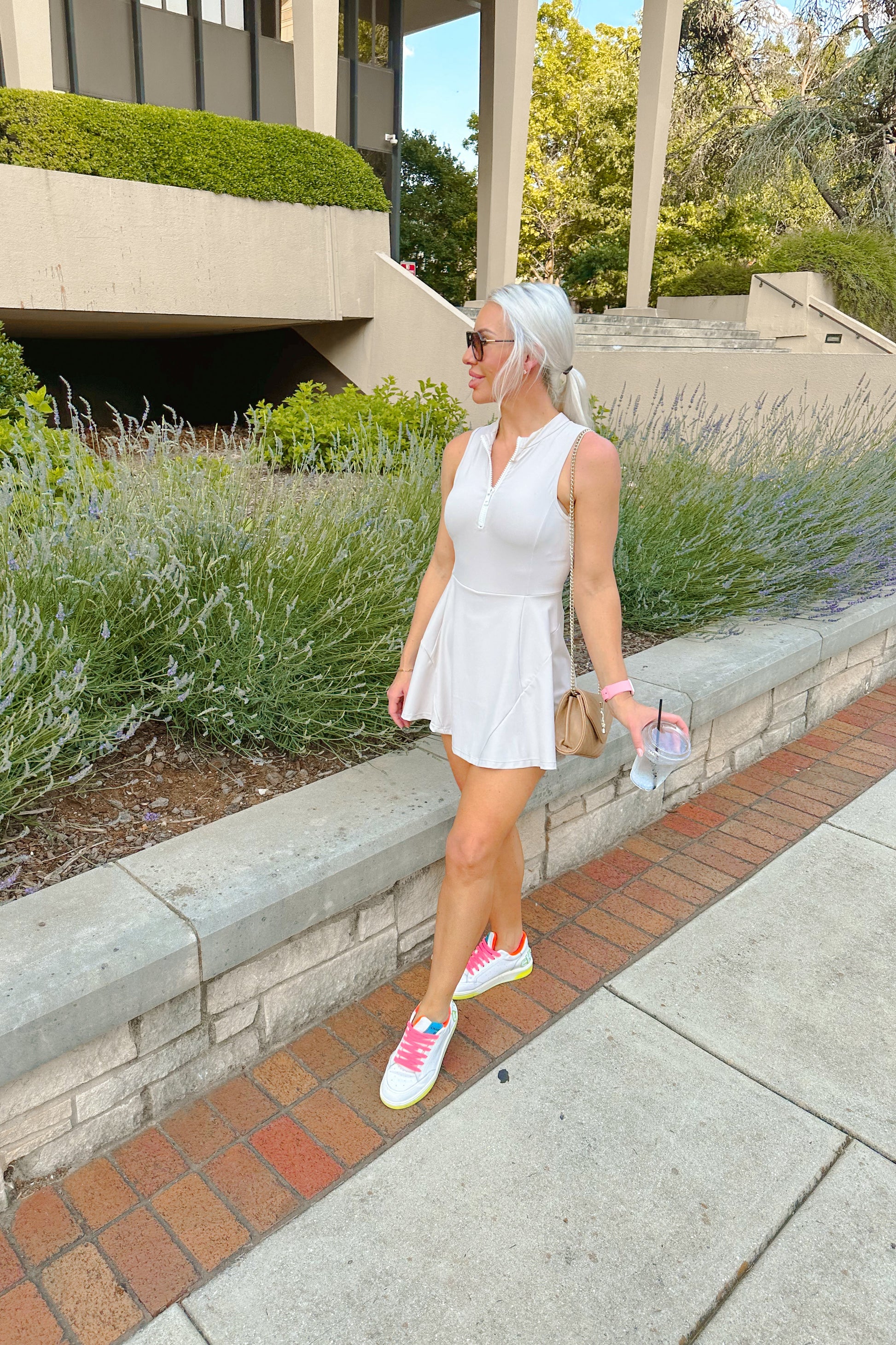 Serve up some style in this Beige Quarter Zip Tennis Dress. Made with stretchy, athletic material, this dress features a white quarter zip, back zip closure, and built-in shorts with pockets for functionality. With a figure-hugging silhouette and mini dress length, it's perfect for playing pickle ball, tennis, or a casual outing with the girls. Game, set, match!