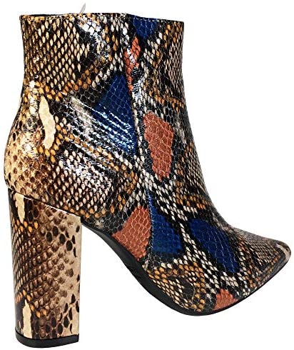 Kendry Collection Boutique's Snake Skin Booties feature a block heel, pointed toe, side zipper closure, and midcalf shaft construction.
