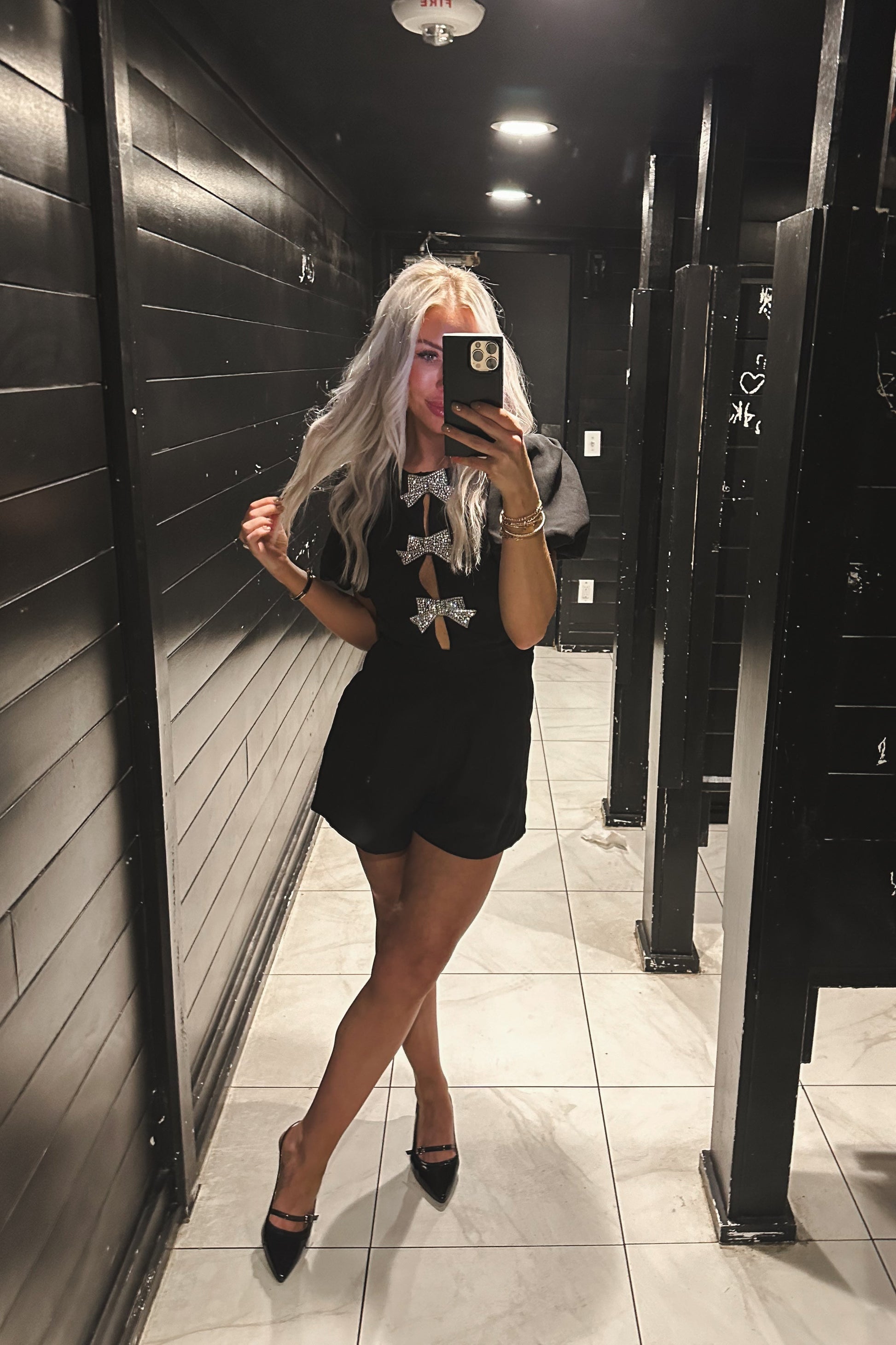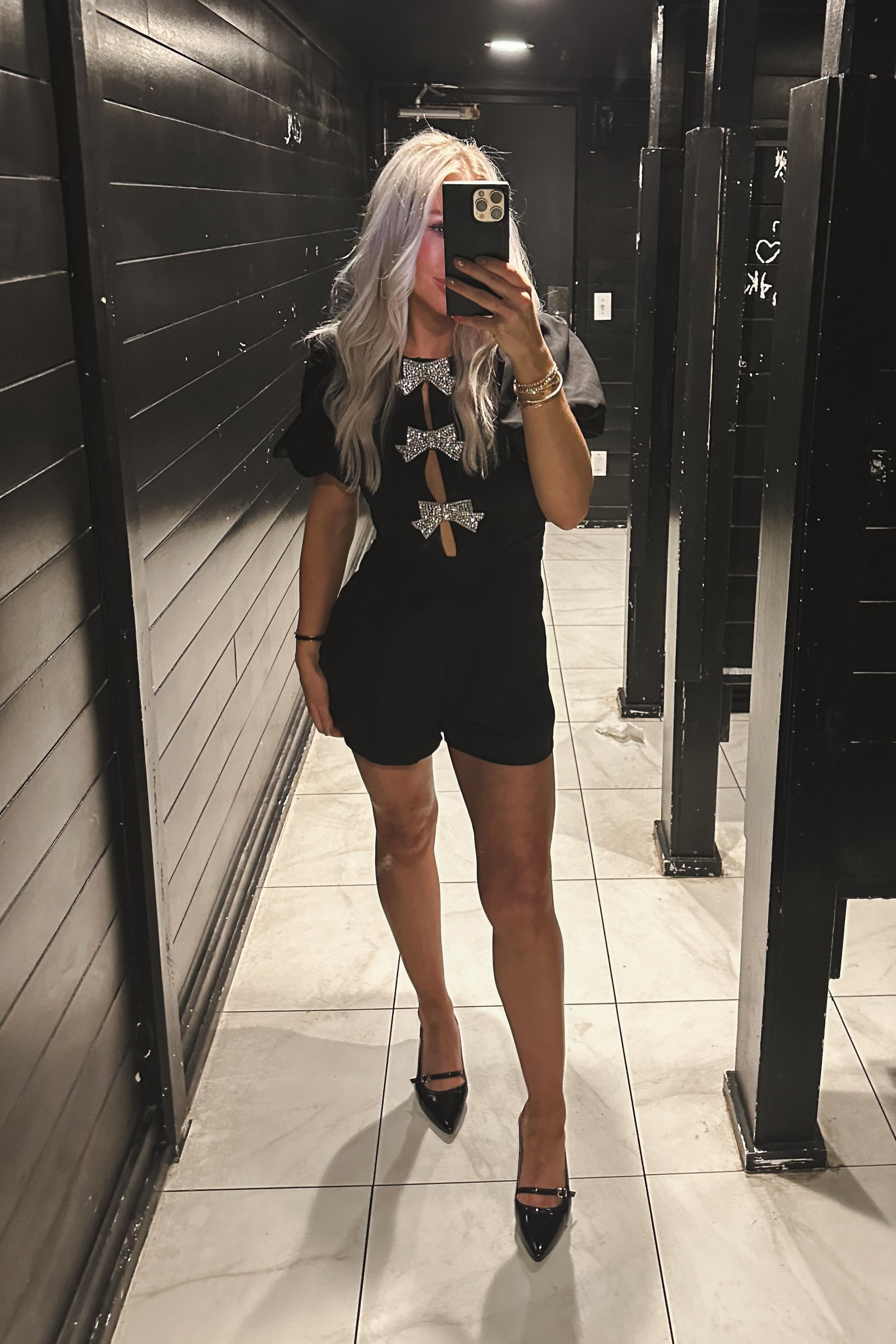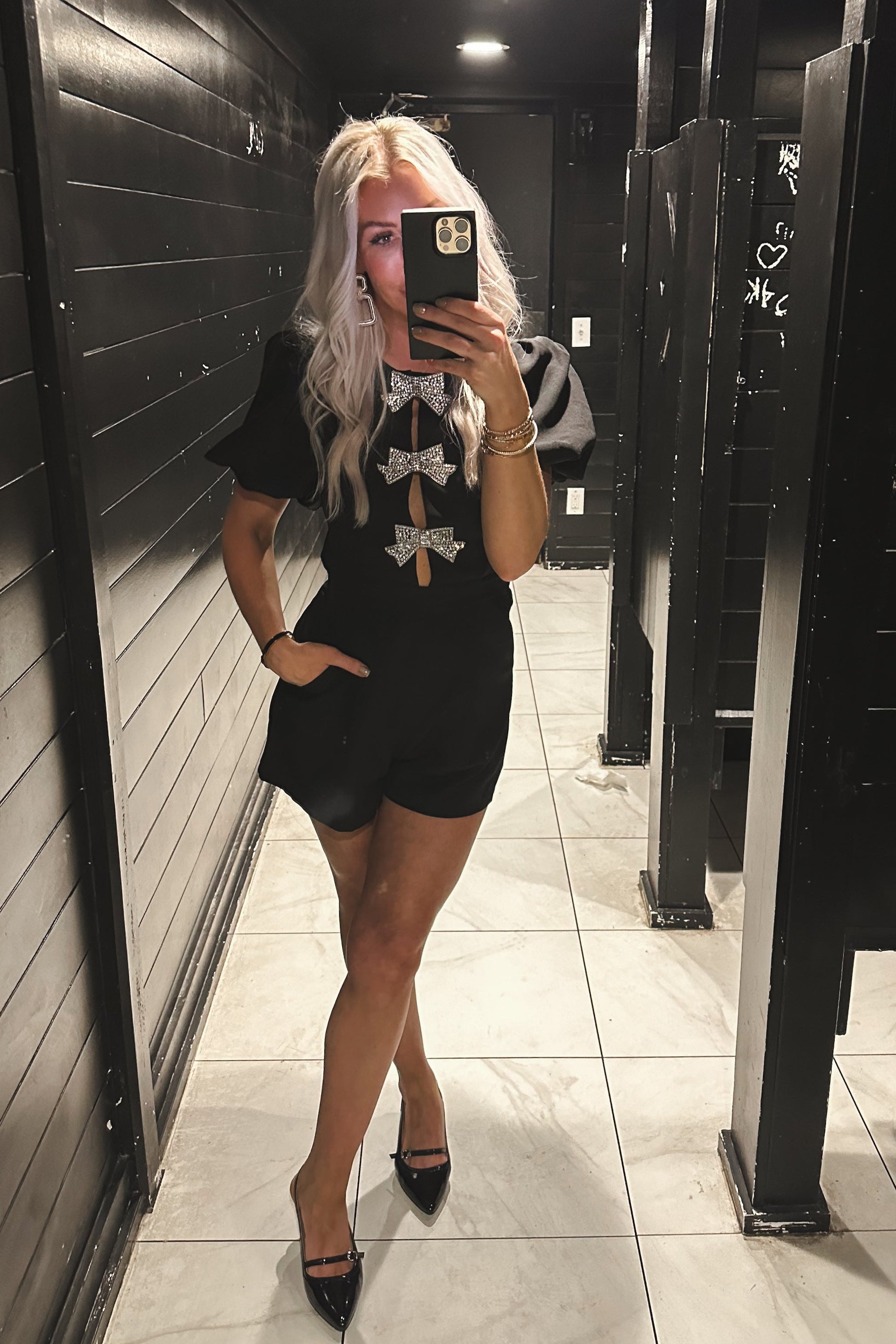 Black Puff Sleeve Romper With Rhinestone Bows