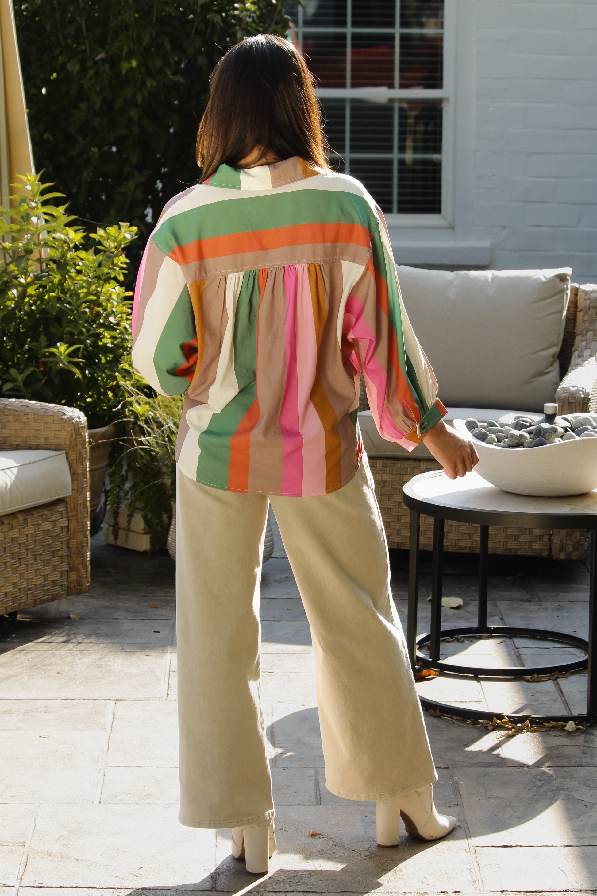 Get ready for the season with our Fall Festival Multicolor Striped Button Down Top! This playful blouse features rich fall colors in green, orange, cream, brown, and magenta, making a stylish statement. Pair it with jeans for a fun and effortless fall look.