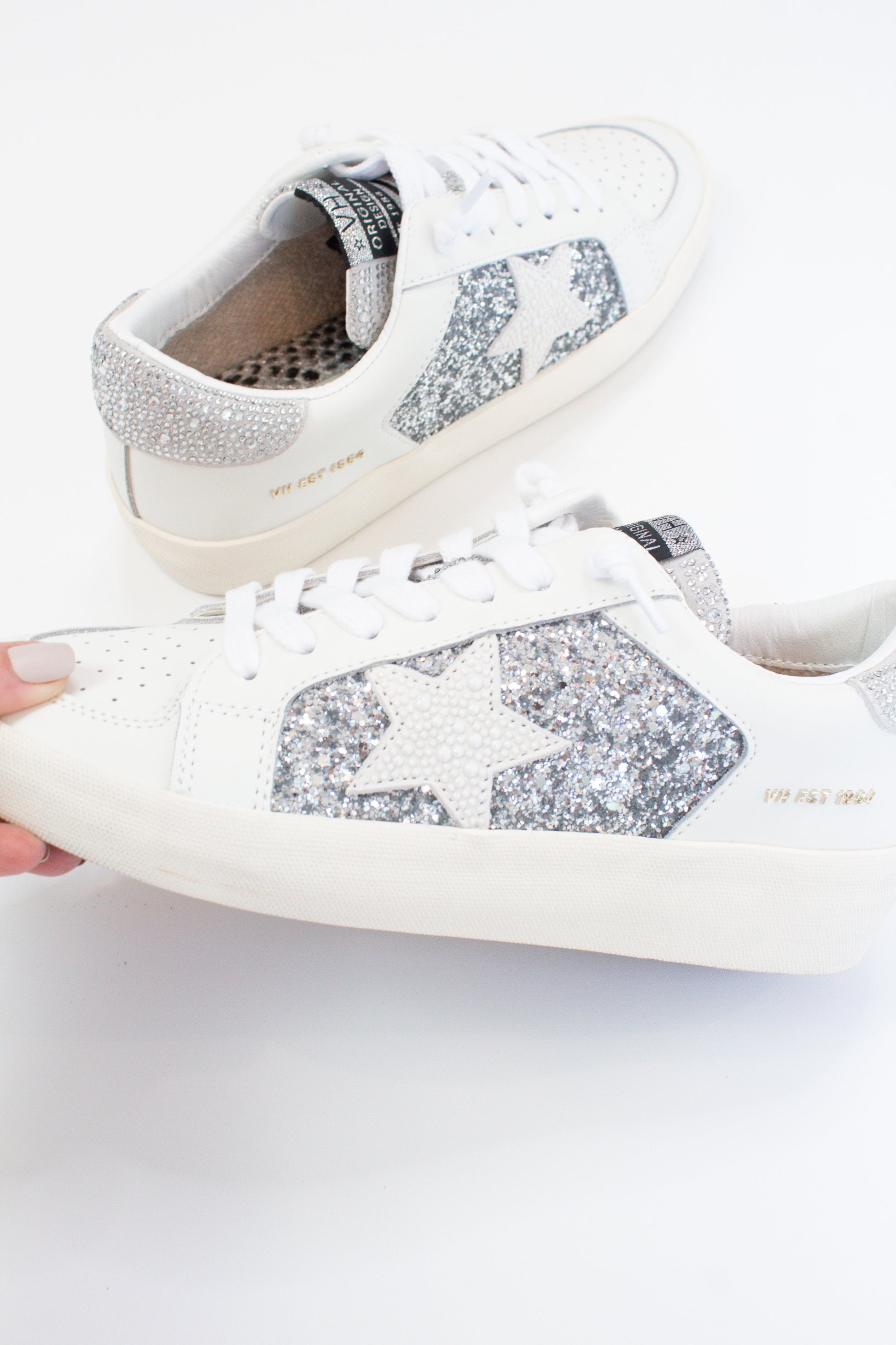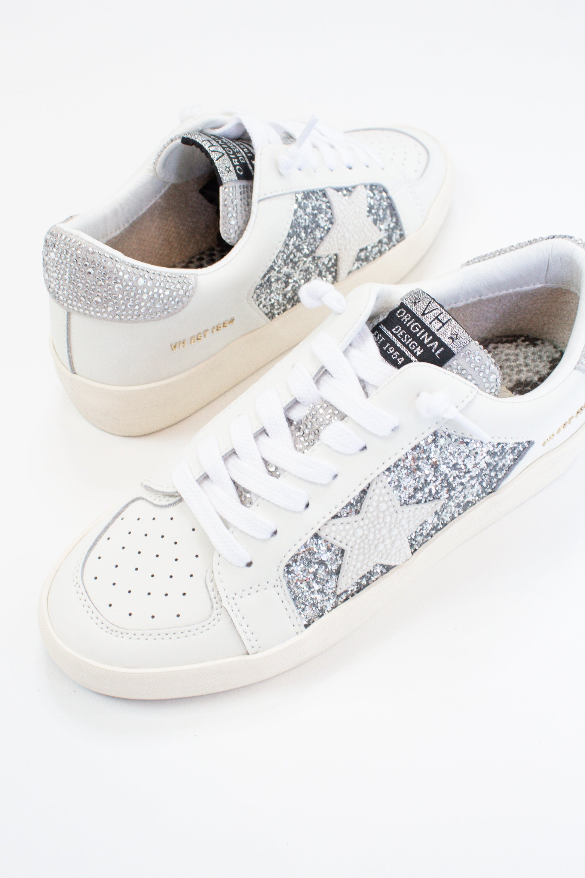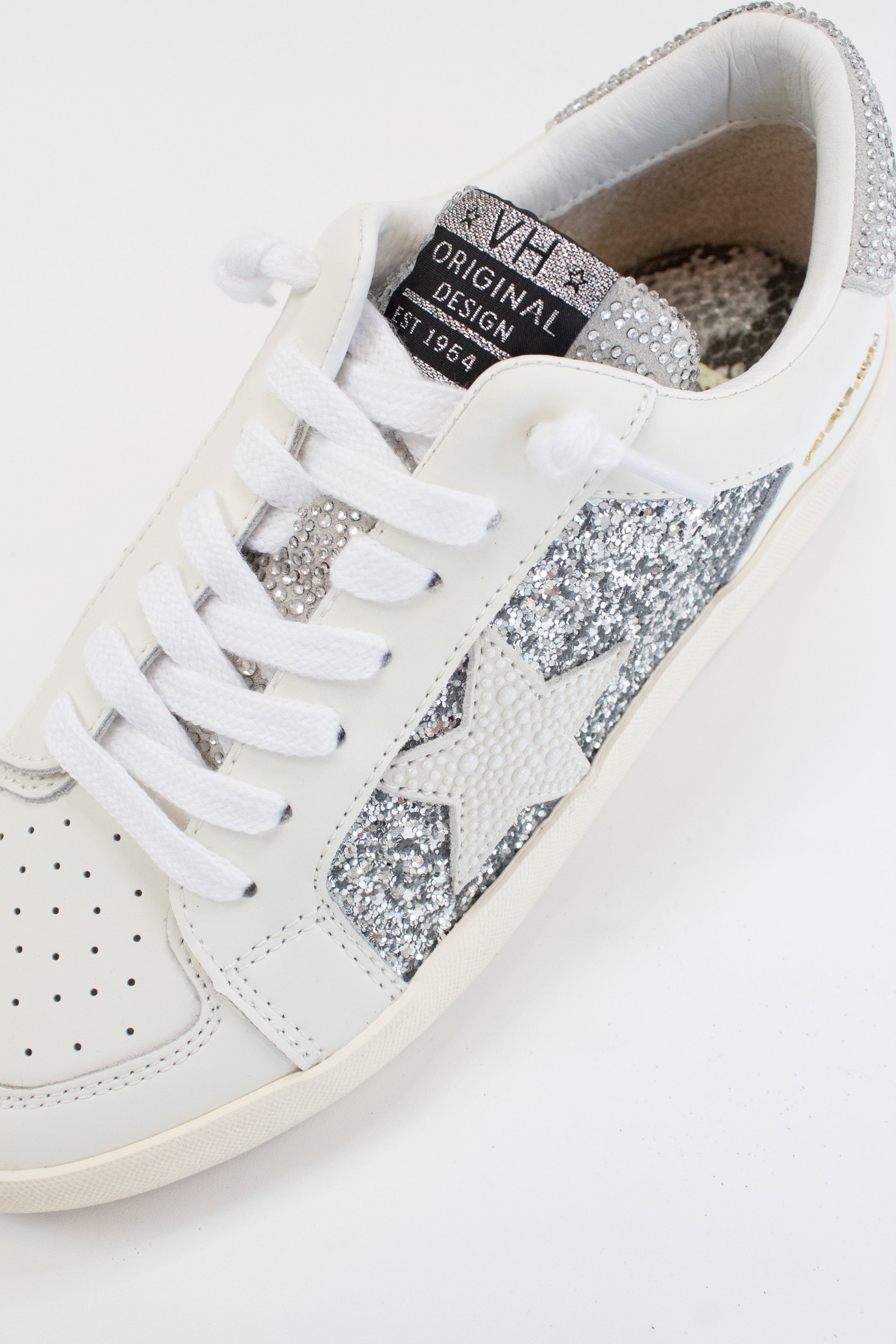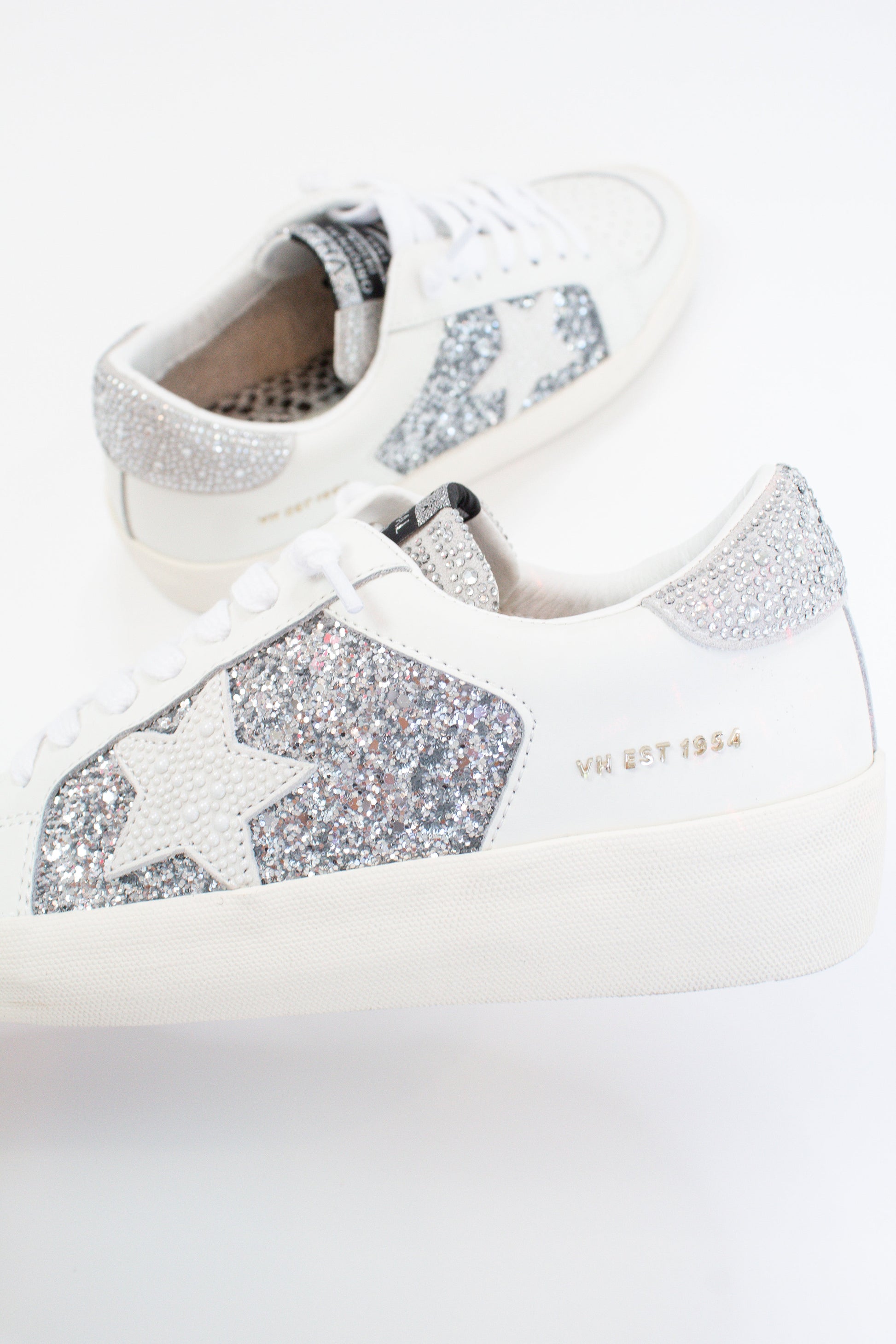Add a touch of sparkle to your outfit with this unique Georgette sneaker! Featuring a low top silhouette, vintage Havana styling, and a glittery exterior, these kicks provide a stylish and comfy addition to any wardrobe. Get ready to turn heads when you step out in these one-of-a-kind shoes!