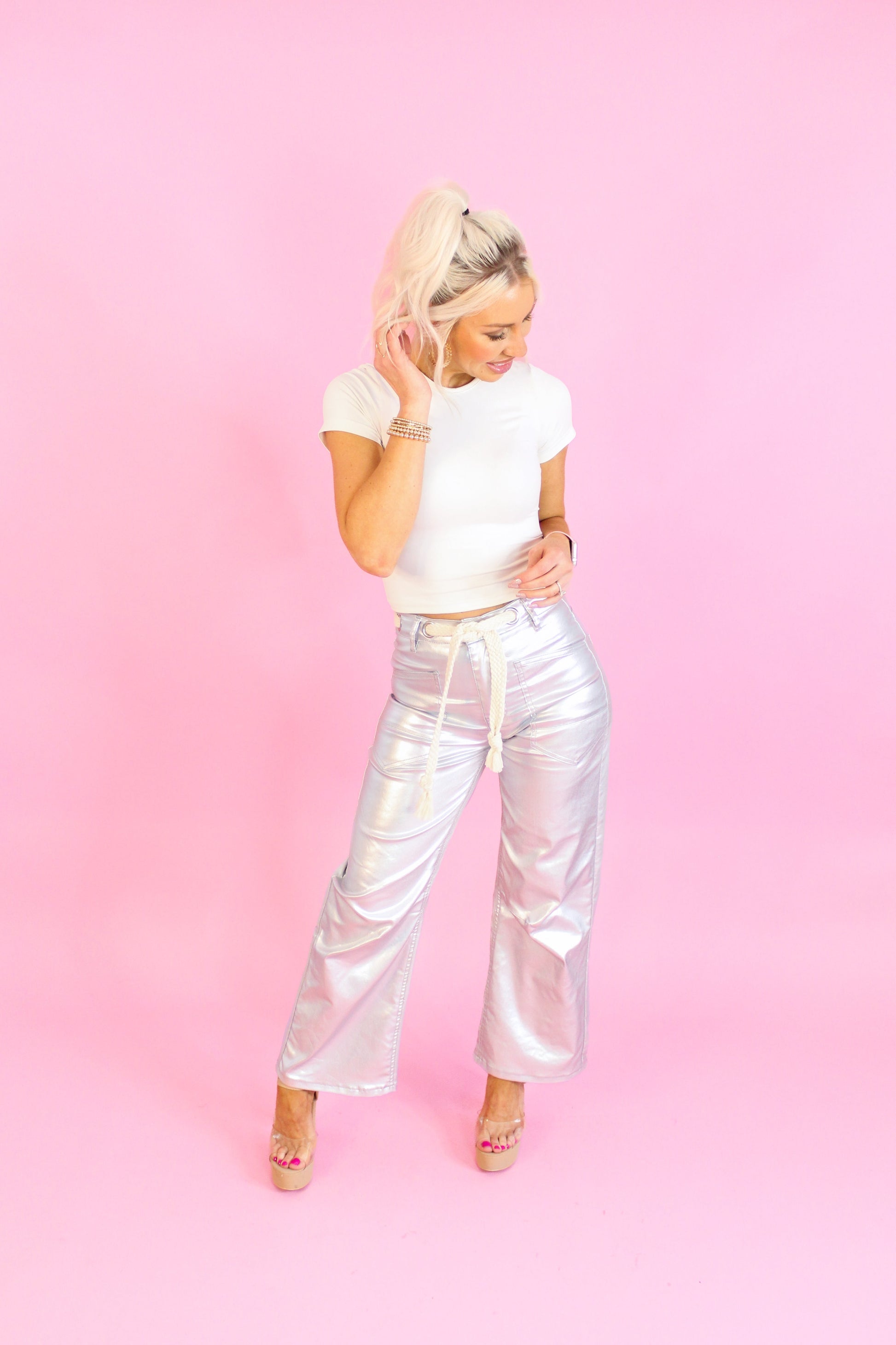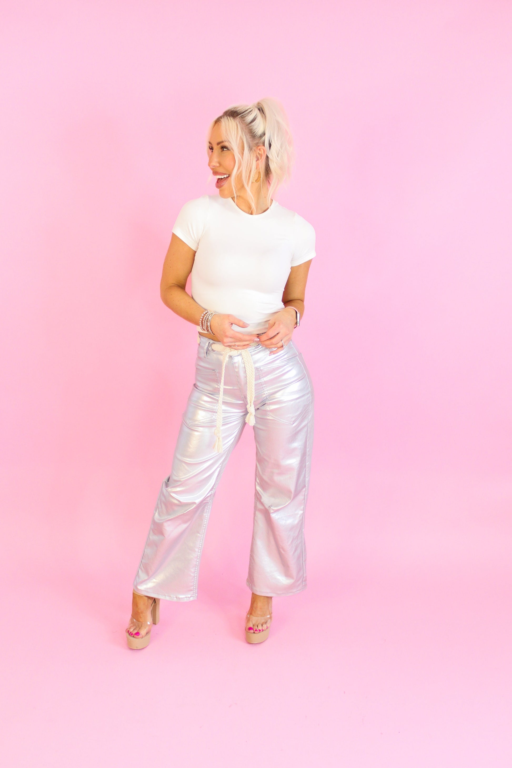 Add a touch of shine to your outfit with our Metallic Silver Barrel Bag Jeans. With a playful rope tie detail, these jeans are sure to stand out and make a statement. Perfect for the fashion-forward individual who likes to have a bit of fun with their style.