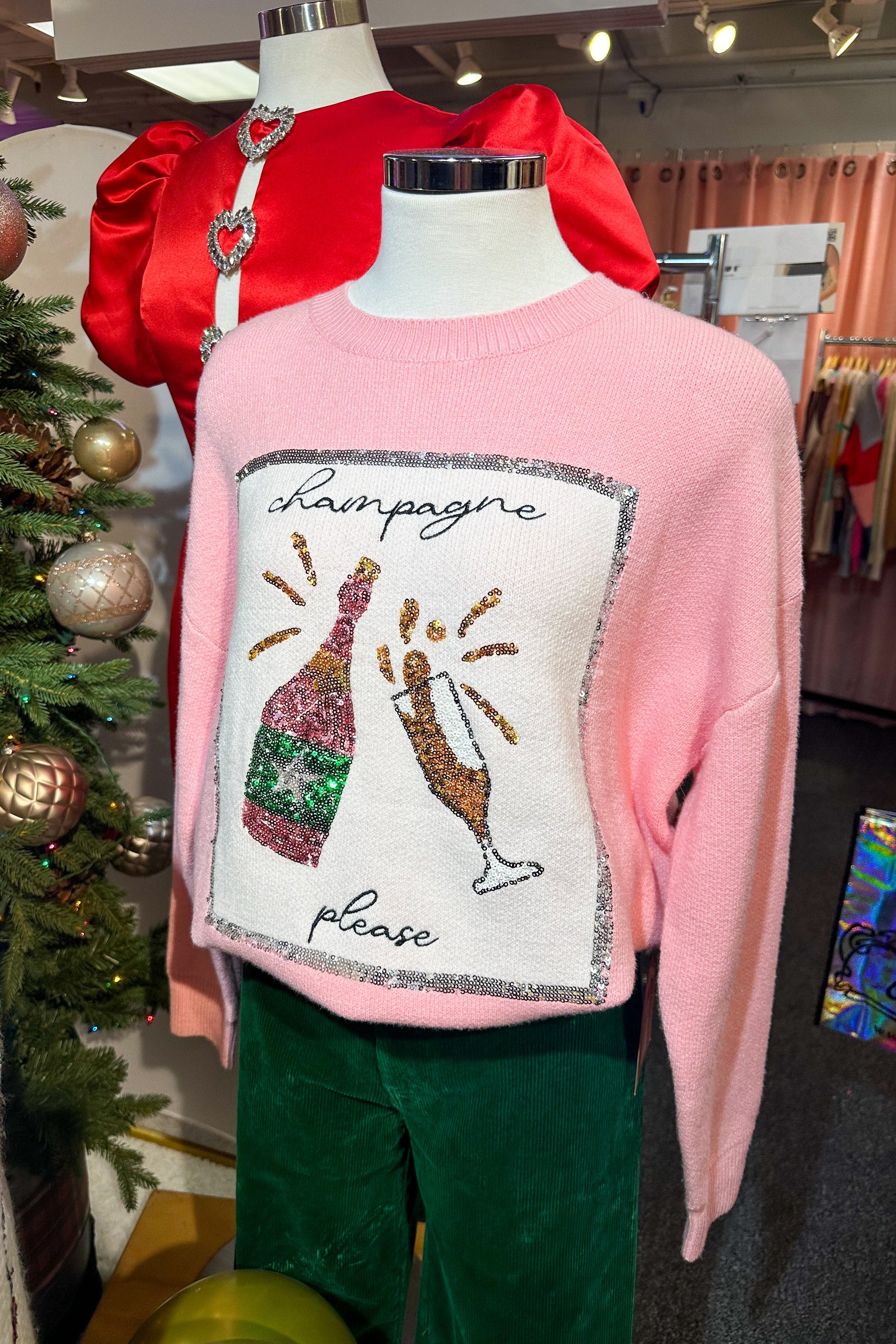 Pink Champagne Bottle Sequined Embroidered Sweater