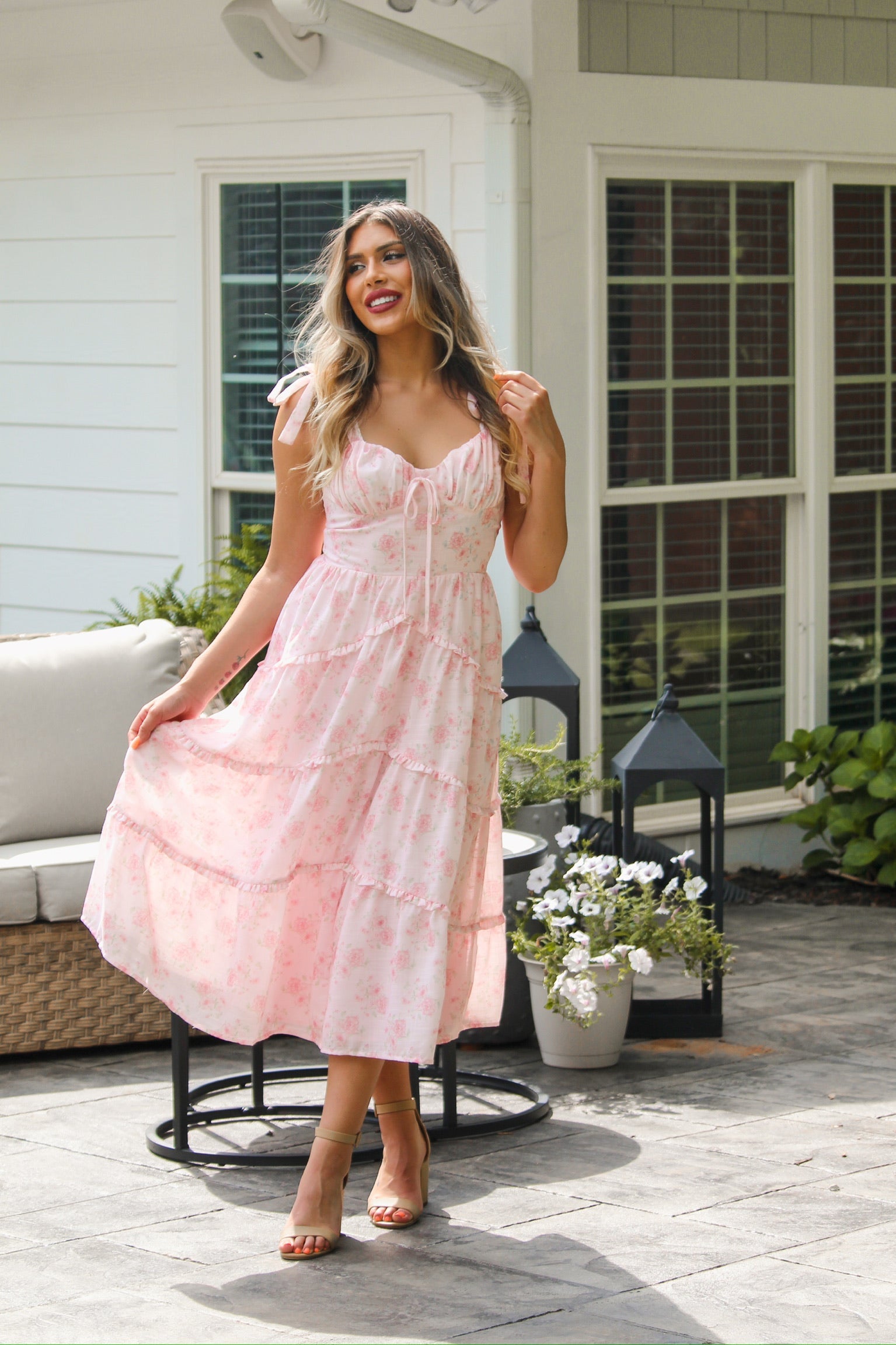 Add some whimsy to your next garden party or wedding with our Pink Floral Bow Tie Midi Dress. This charming dress features a playful bow tie on the shoulders and a beautiful floral pattern, perfect for the fun-loving and fashion-forward wedding guest!