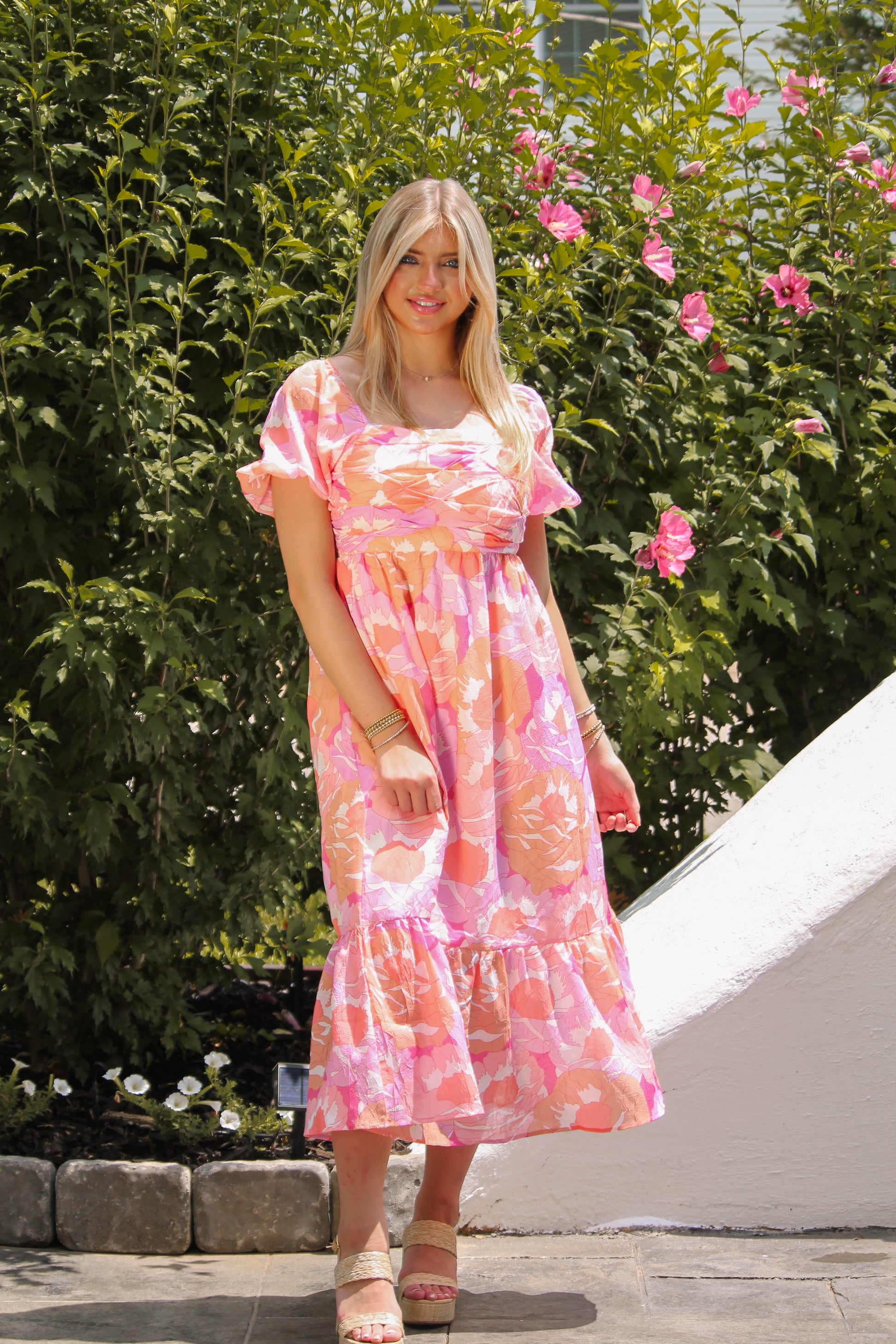 Look effortlessly chic in this Pink Floral Puff Sleeve Midi Dress. Perfect for the wedding guest, the midi length and puff sleeves provide elegant coverage without sacrificing style. The floral pattern adds a playful touch, making this dress stand out from the crowd!