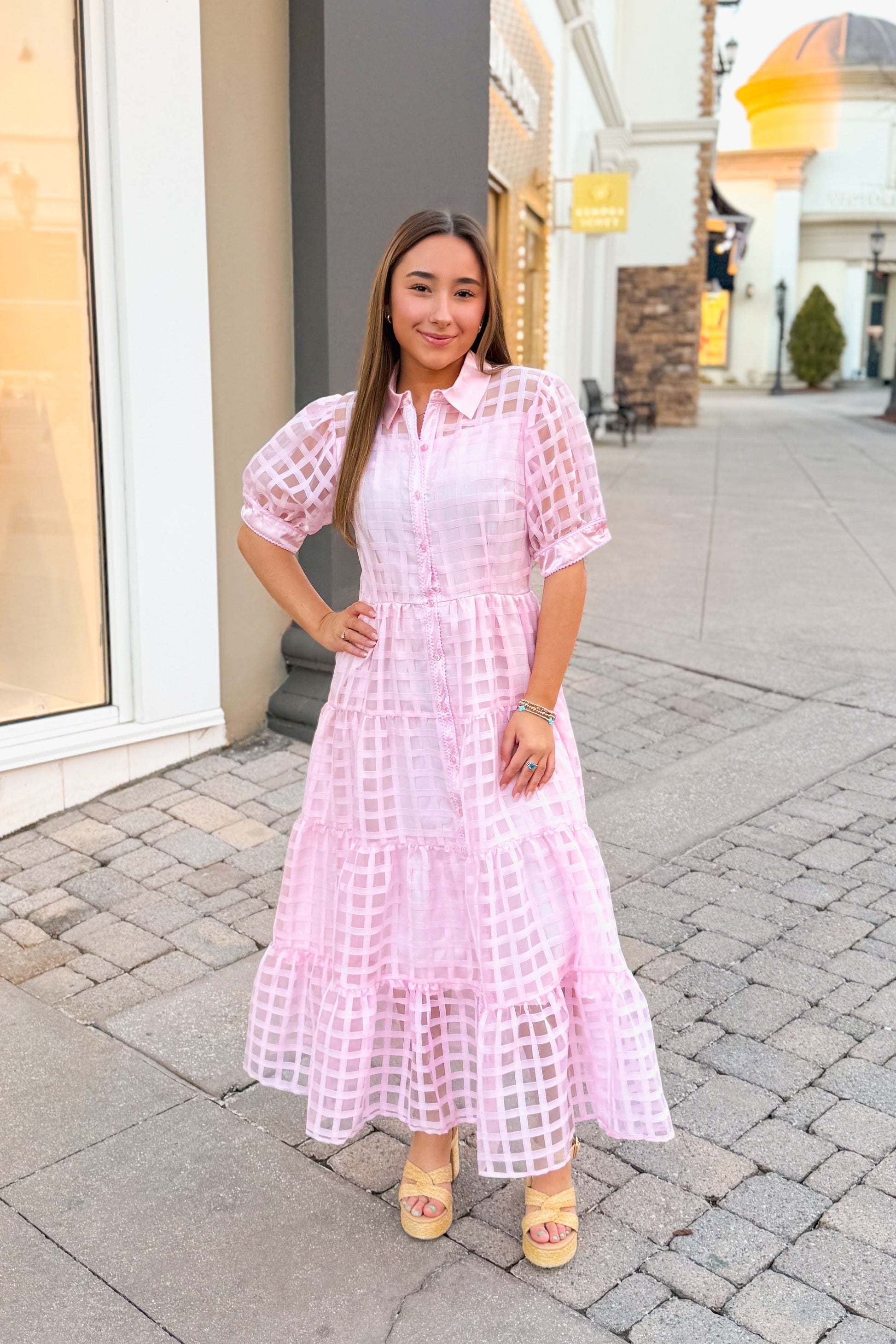 Get ready to turn heads with our Pink Plaid Sheer Puff Sleeve Midi Dress! Made with a stunning plaid pattern and sheer organza fabric, this dress exudes style and elegance. Perfect for baby showers and wedding parties, you'll feel confident and chic in this unique piece.?