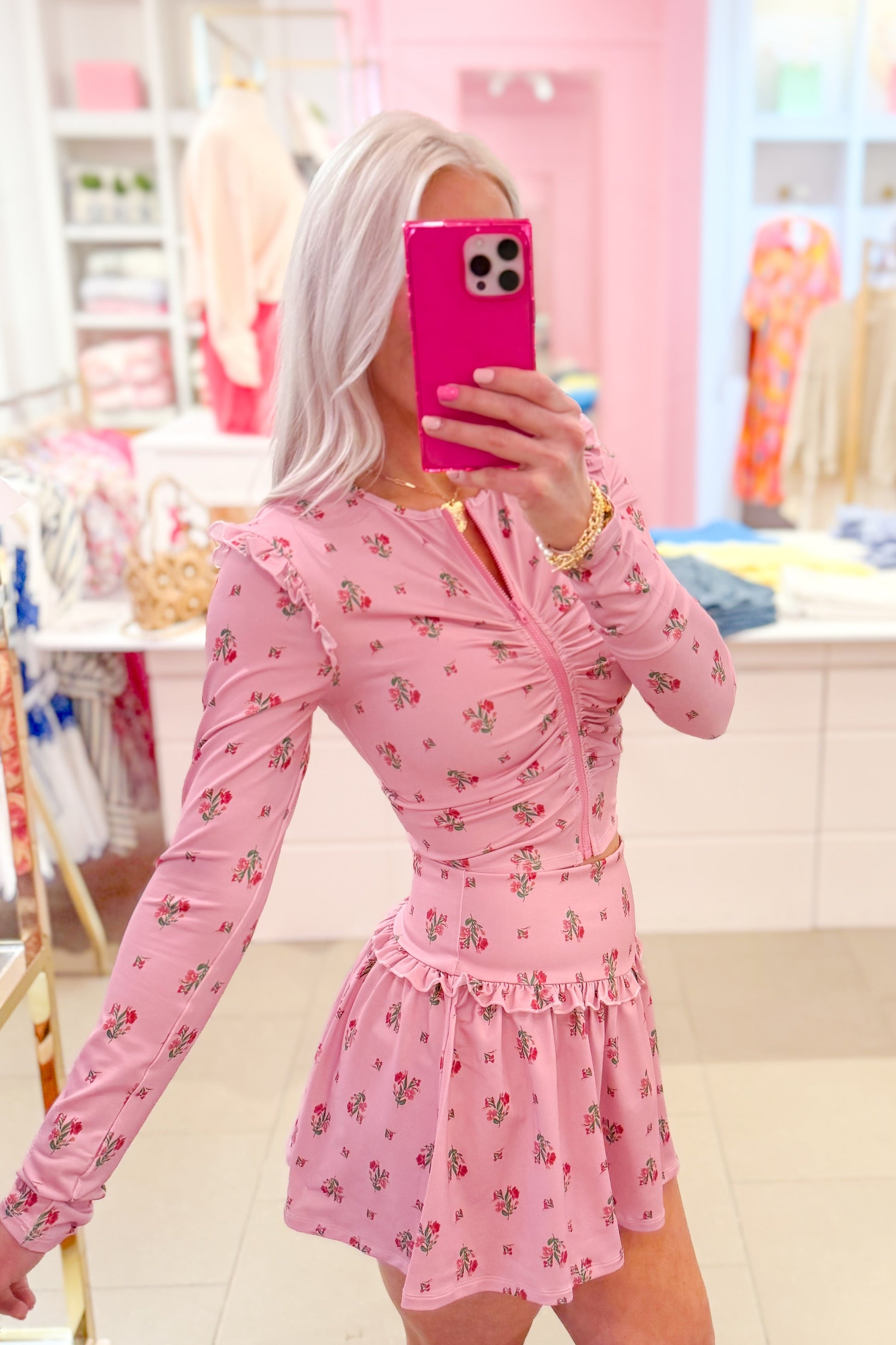 Pink Ruched Ditsy Floral Athletic Jacket