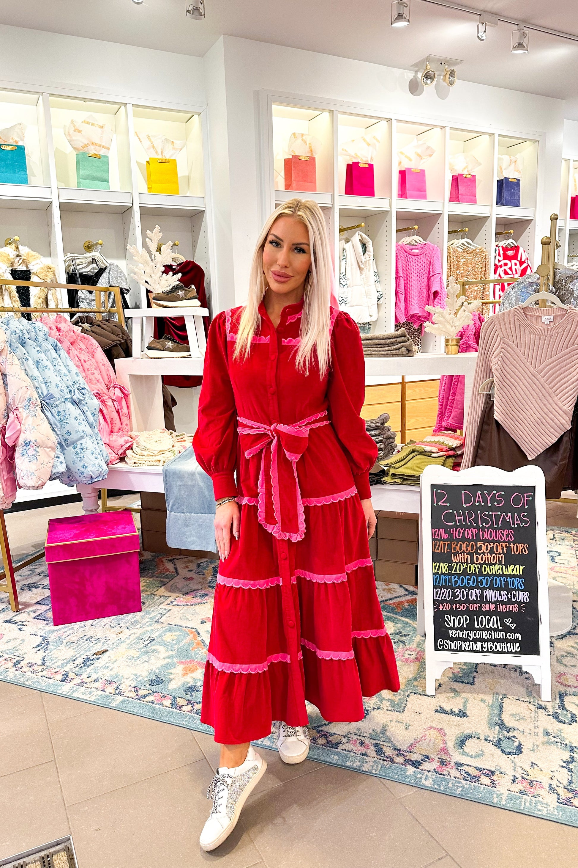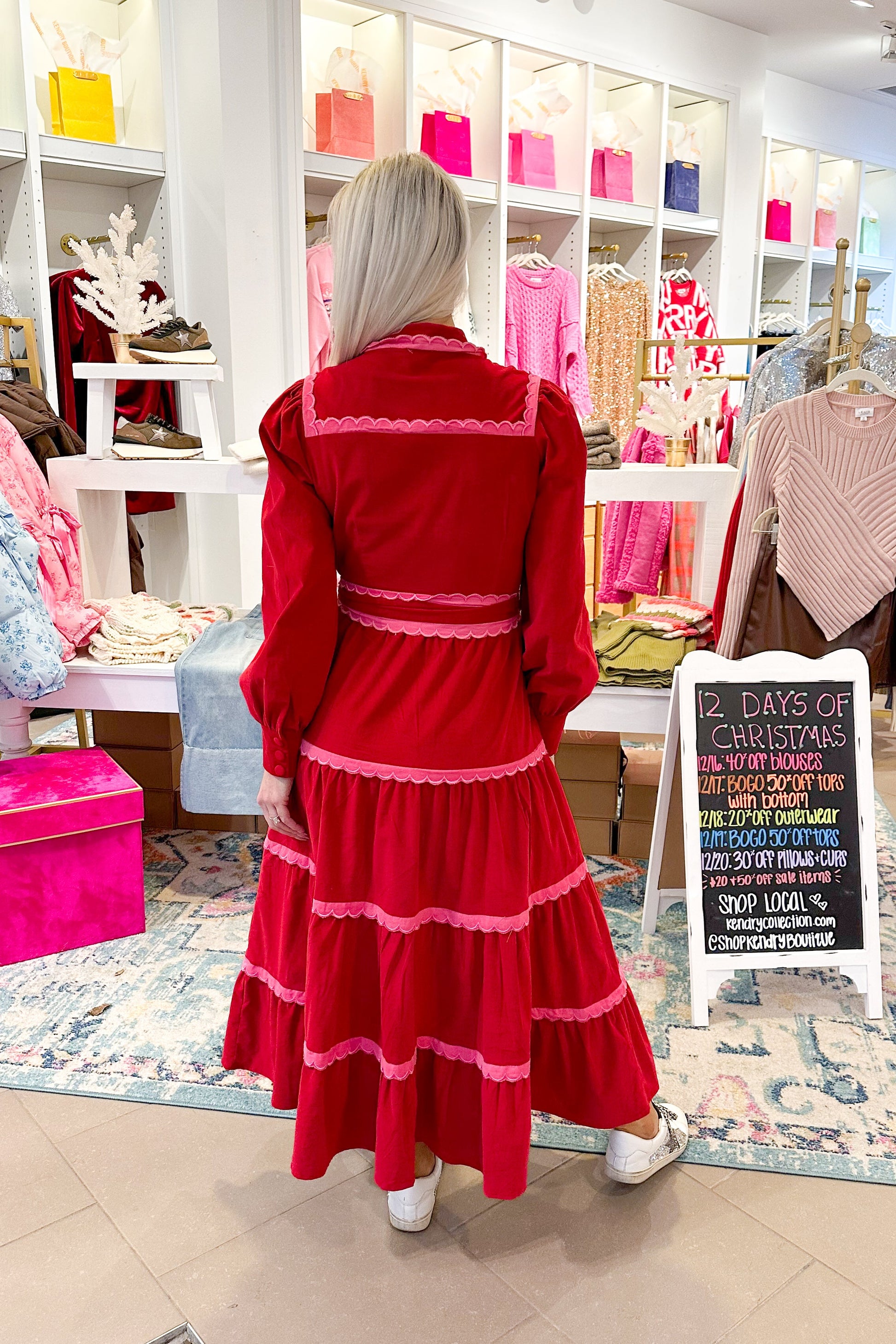 Red and Pink Tiered Scalloped Detail Long Sleeve Midi Dress