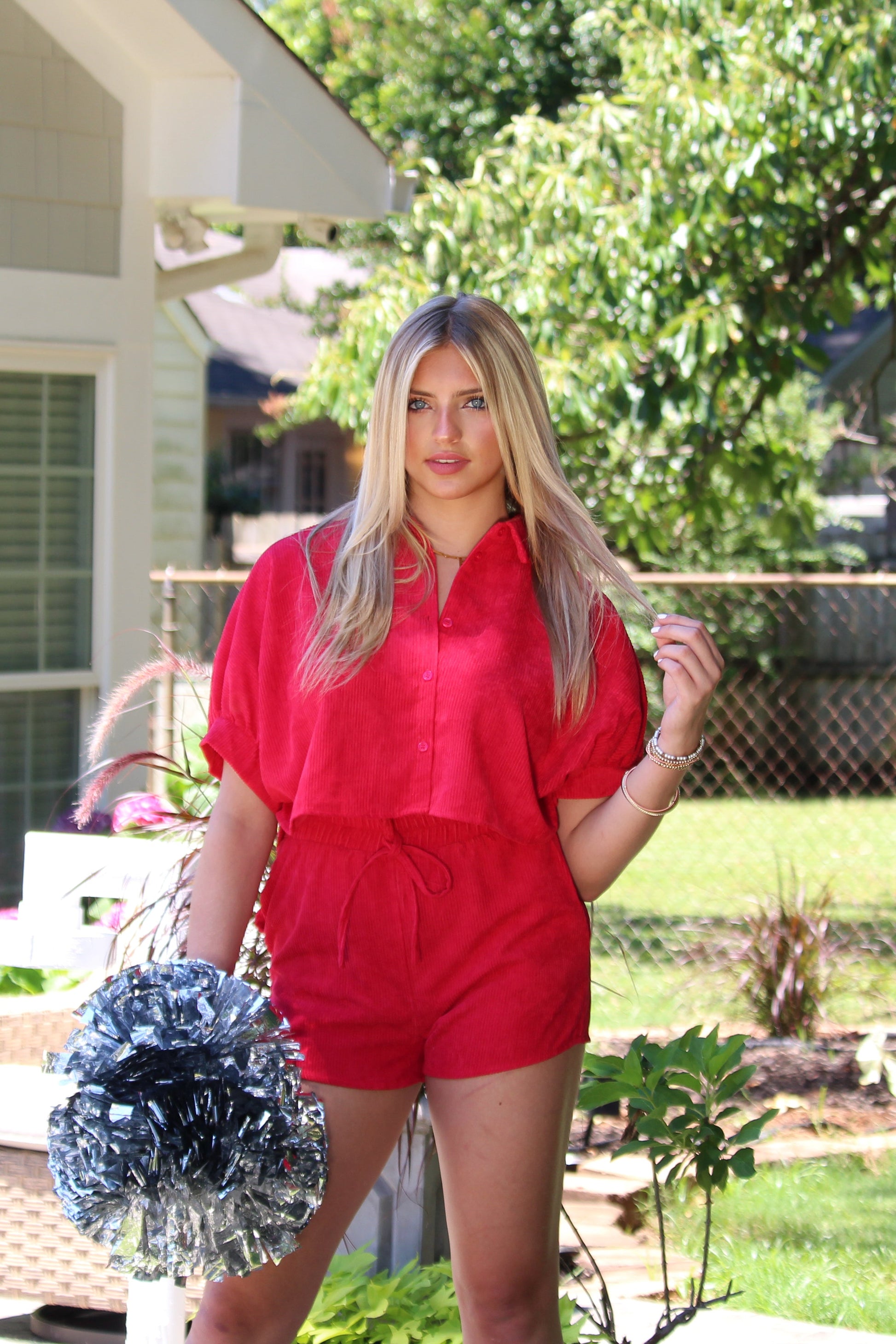 Red Corduroy Button Down Short Set
