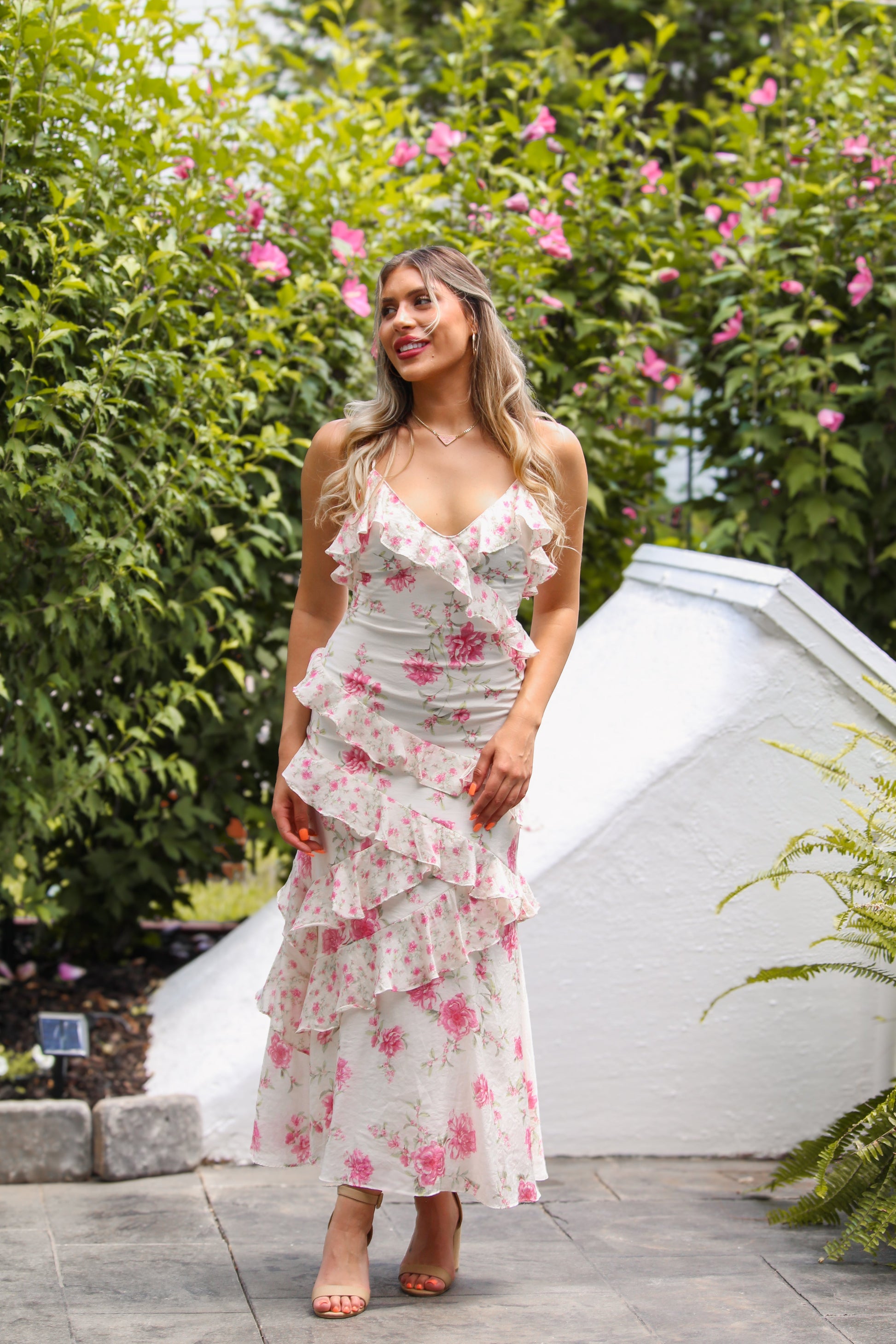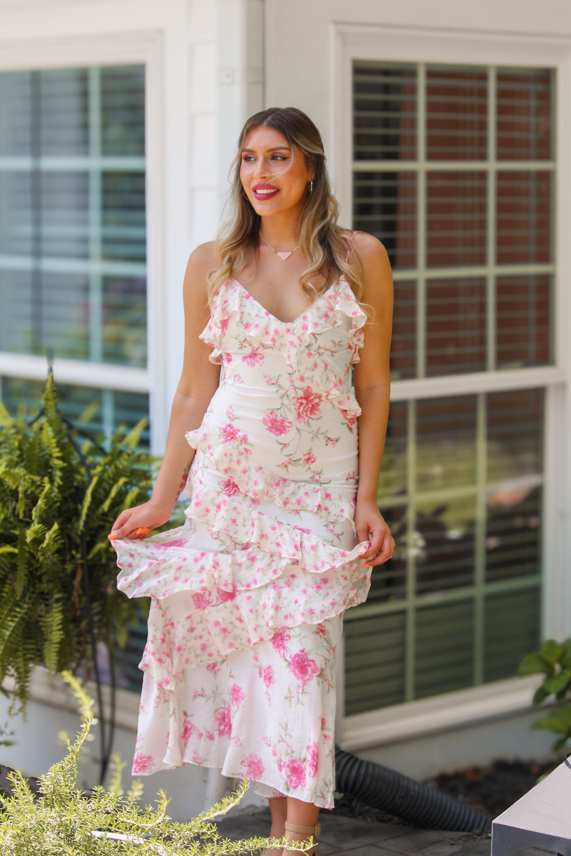 Get ready to bloom in our white and pink floral ruffle maxi dress! Perfect for a garden party or graduation celebration, this dress will have you feeling fresh and fashionable. It's the perfect mix of trendy and sophisticated!