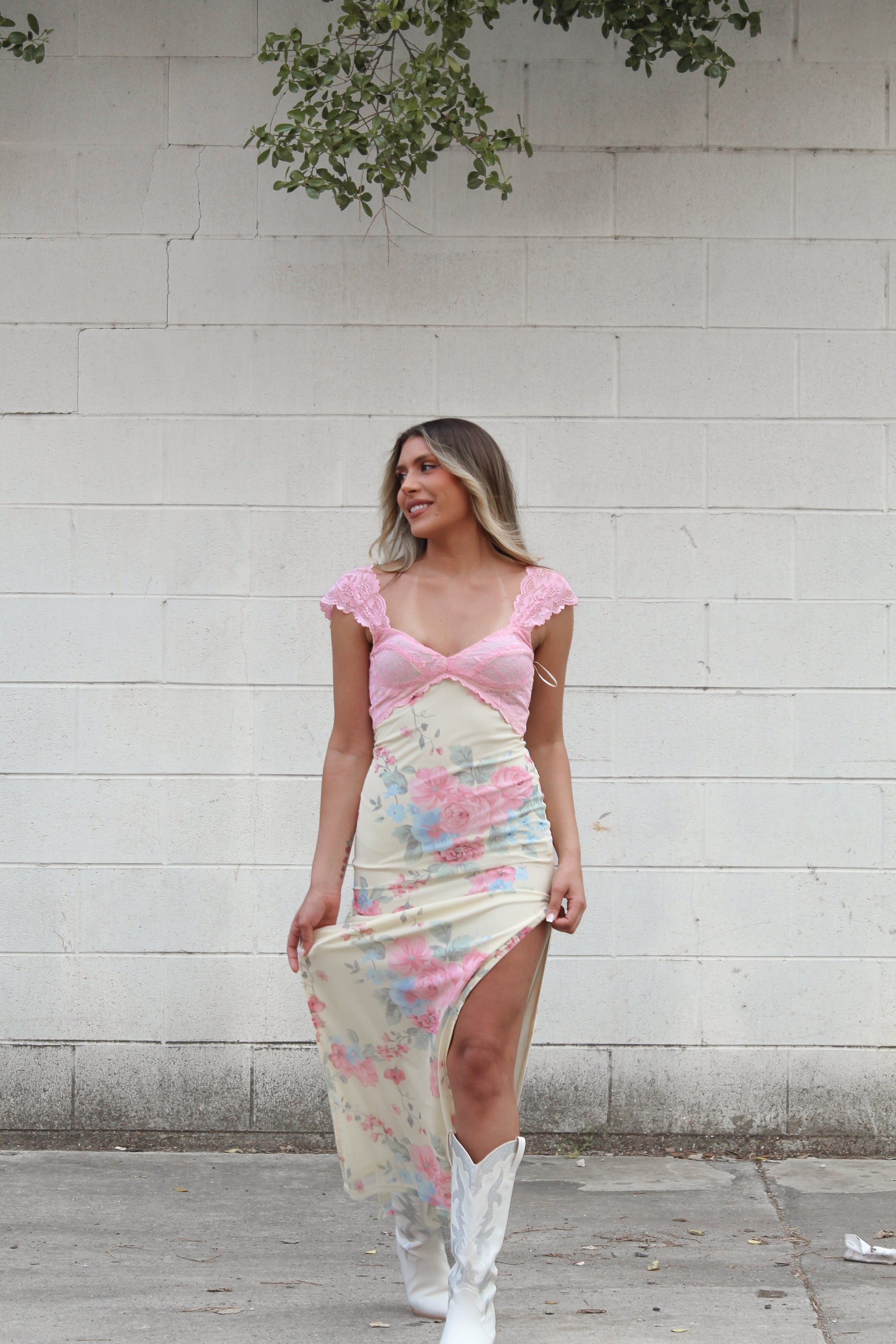 Yellow Floral Pink Lace Detail Slit Maxi Dress